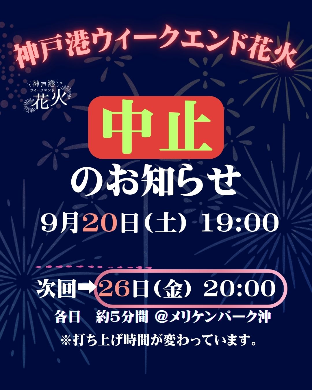On Saturday, September 20th, Kobe-port-weekend-fireworks has been canceled because strong wind is expected.