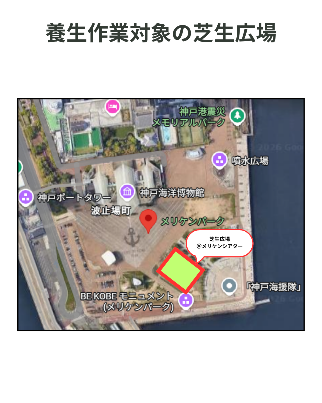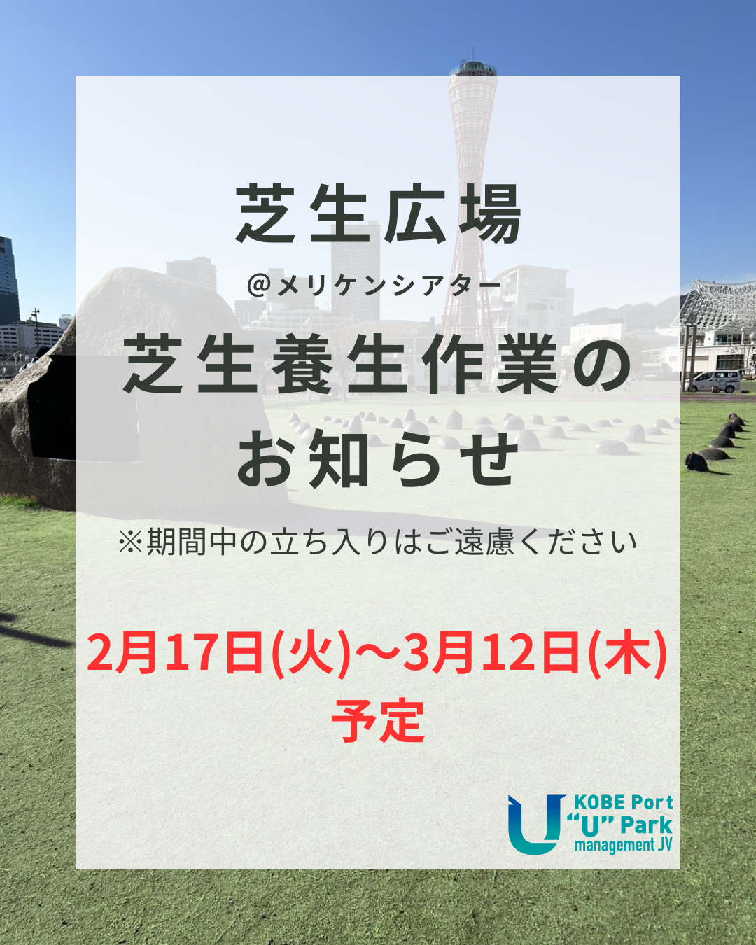 以下の日程は、芝生養生作業のため、芝生広場(@メリケンシアター)への立ち入りはご遠慮いただくようご協力お願いいたします。